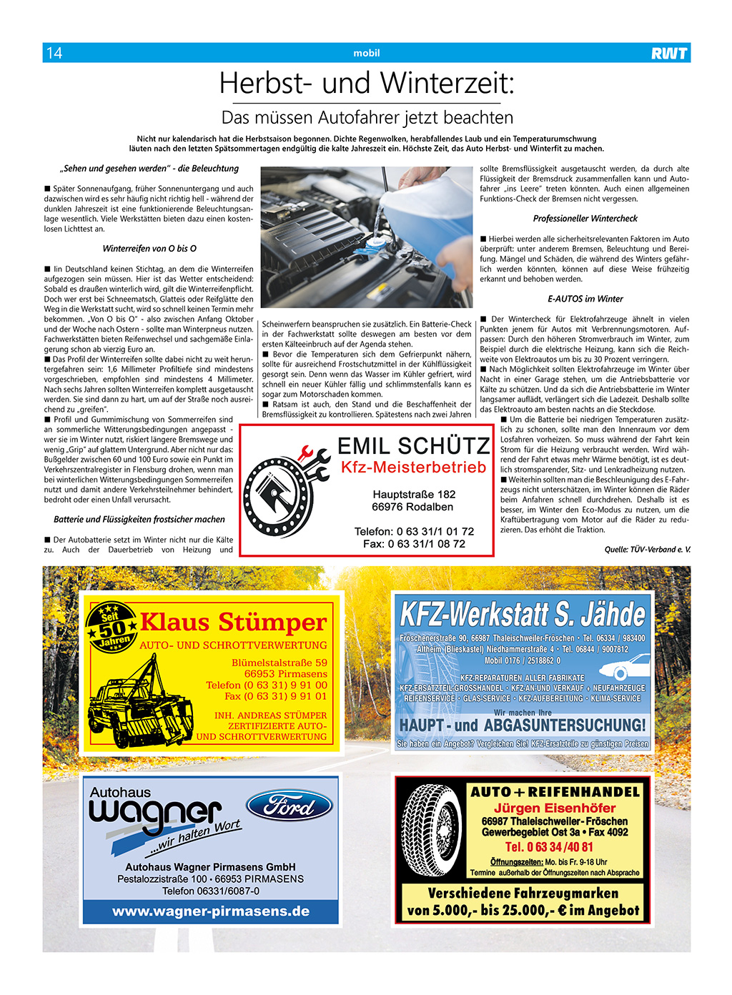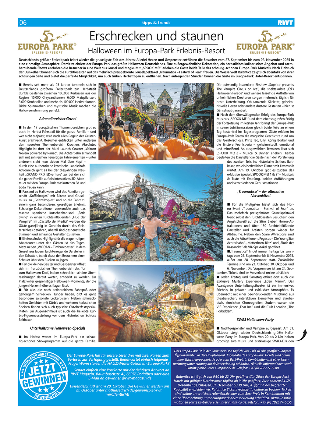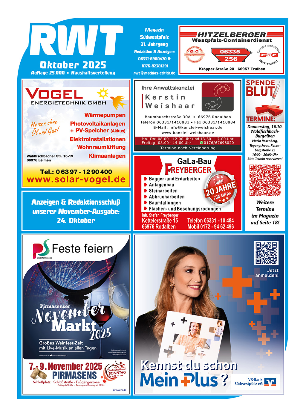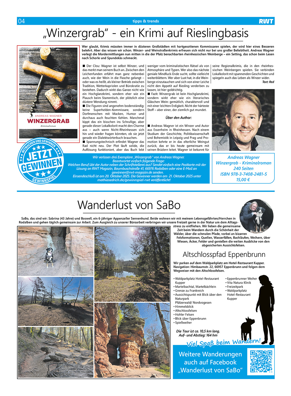 Gewinnspiele RWT Magazin Oktober 2025 Einsendeschluß für unsere Gewinnspiele ist am 20. Oktober Die Gewinner werden am 21. Oktober an dieser Stelle veröffentlicht! Viel Spaß beim Rätseln! Sendet einfach eine Postkarte mit der Lösung bzw. dem Stichwort an: RWT Magazin, Baumbuschtstr. 41, 66976 Rodalben oder eine E-Mail an gewinnen@rwt-magazin.de Jetzt teilnehmen! Gewinner Ausgabe Oktober …