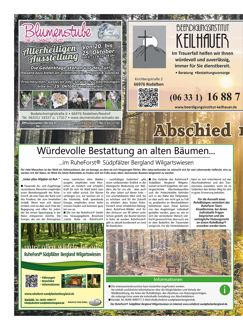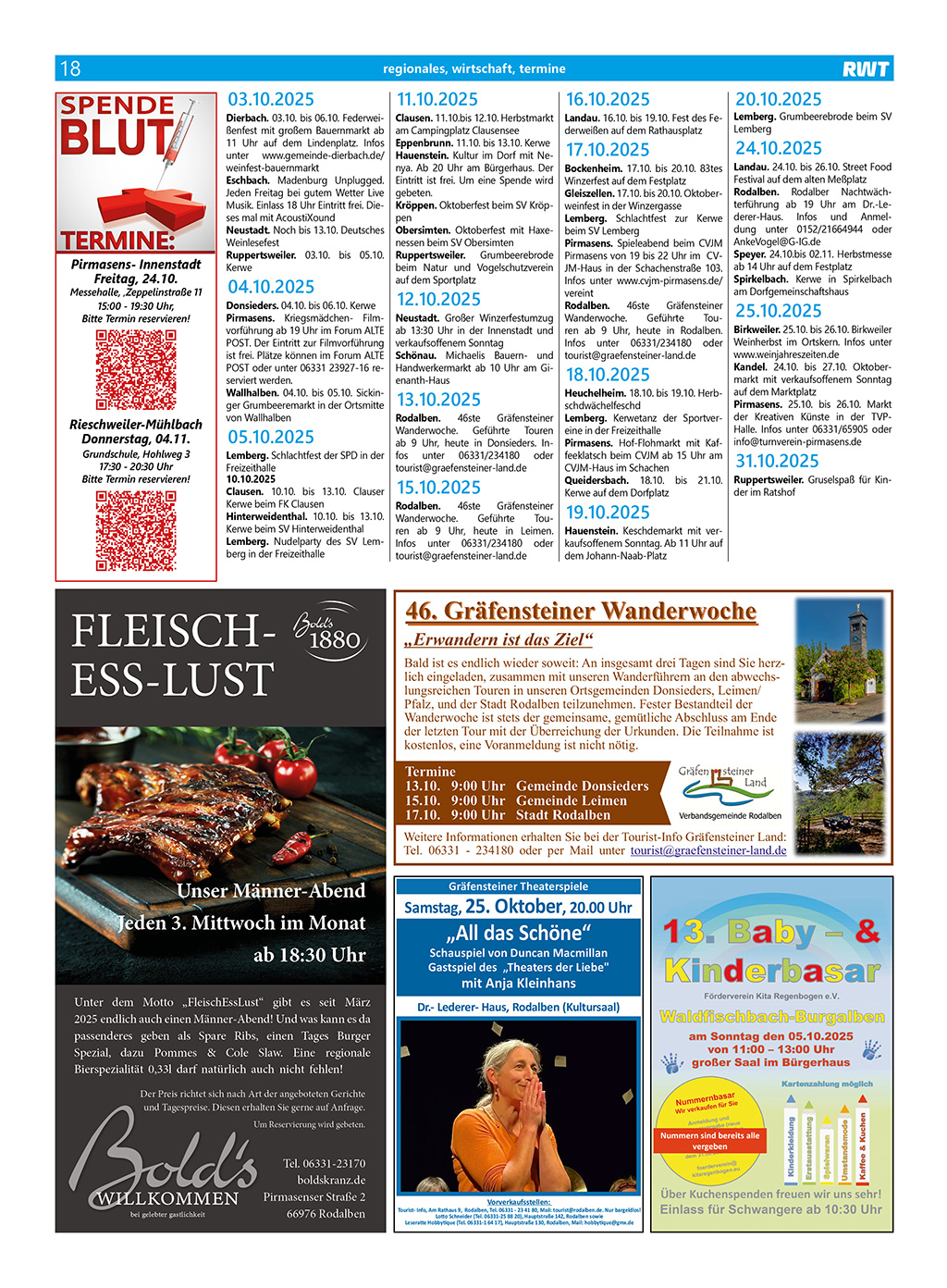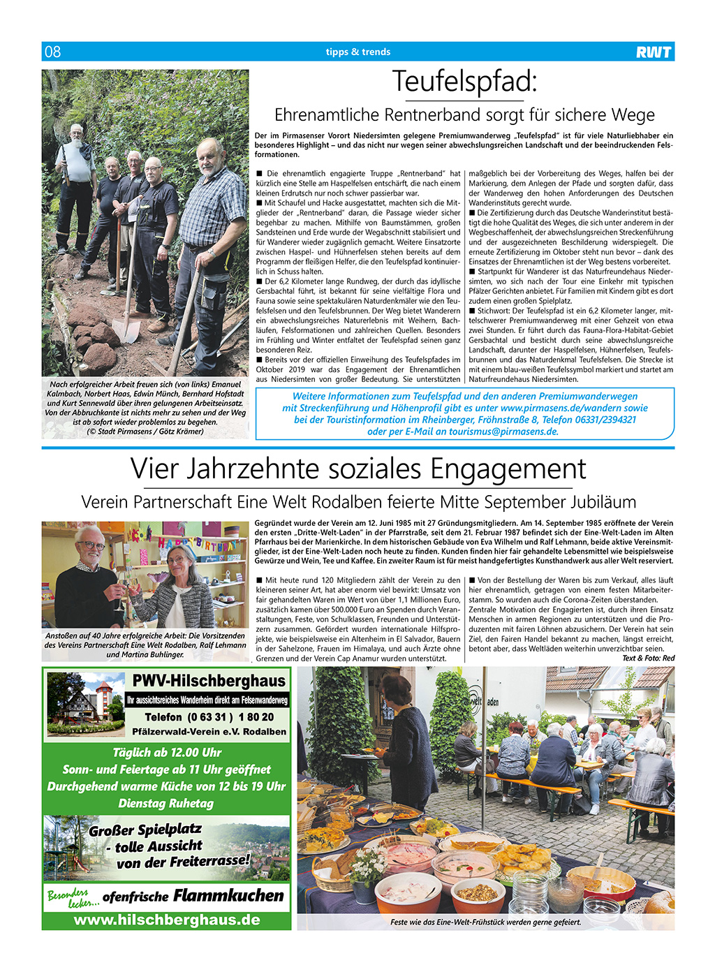 Liebe Leser! Der Sommer ging mit Herbstwetter und der Herbst startet mit Goldenen- Oktobertagen. Uns solls recht sein, Hauptsache, der Regen bei einstelligen Temperaturen ist zumindest für einige Tage weggezogen. Die Wälder werden bunt und laden zu langen Spaziergängen ein, diese Einladung sollte wir unbedingt wahrnehmen. Und vielleicht mal den Premiumweg Teufelspfad bei Niedersimten laufen. …
