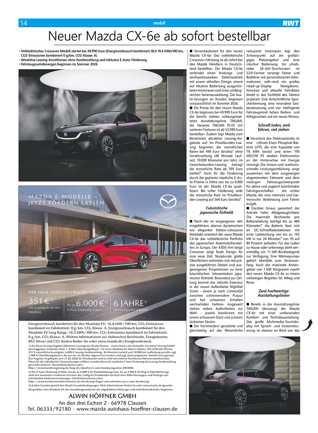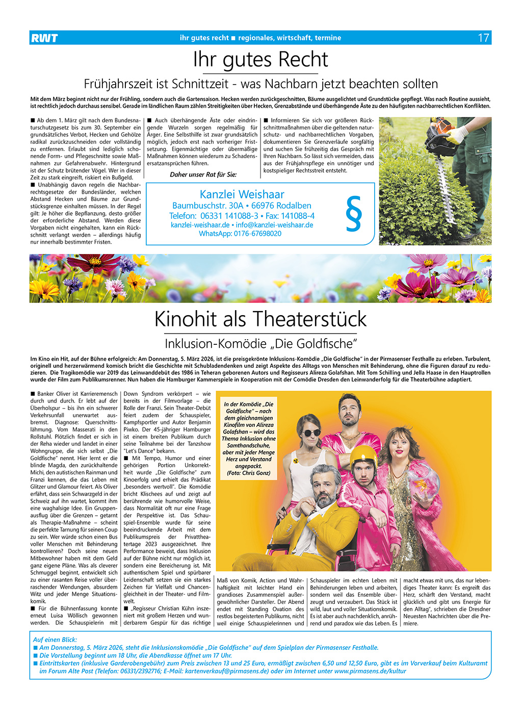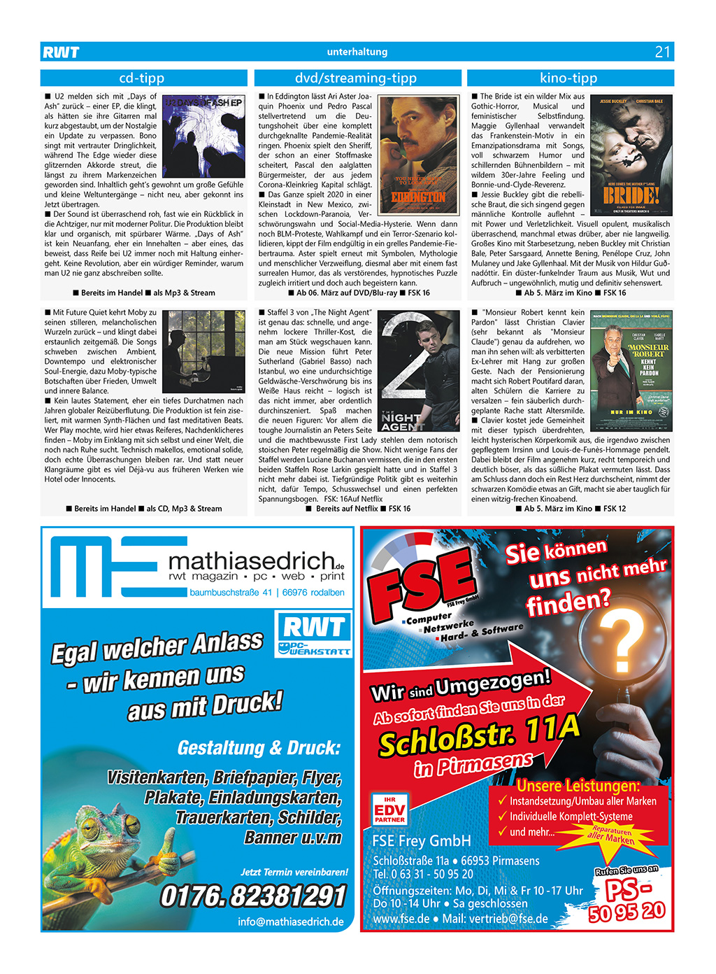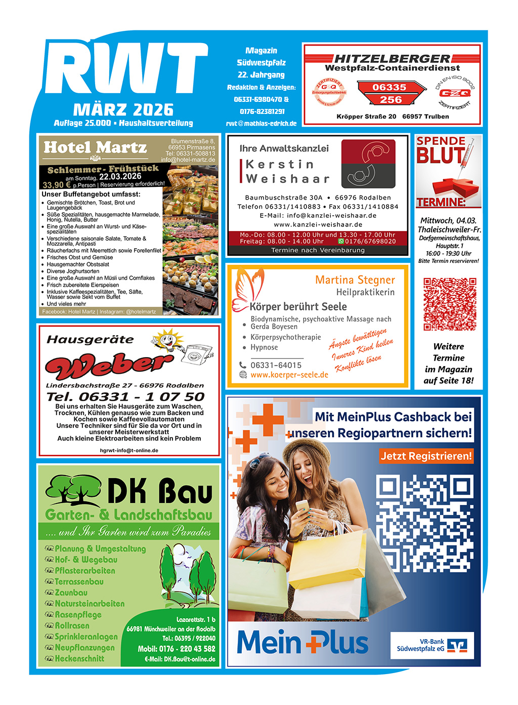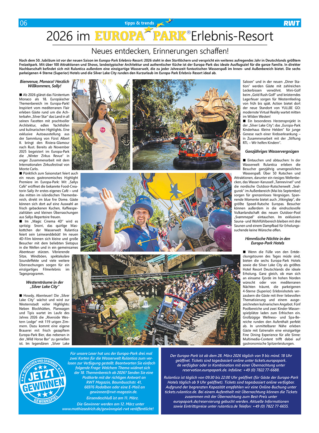 Gewinnspiele RWT Magazin Februar 2026 Einsendeschluß für unsere Gewinnspiele ist am 11. Februar Die Gewinner werden am 12. Februar an dieser Stelle veröffentlicht! Viel Spaß beim Rätseln! Sendet einfach eine Postkarte mit der Lösung bzw. dem Stichwort an: RWT Magazin, Baumbuschtstr. 41, 66976 Rodalben oder eine E-Mail an gewinnen@rwt-magazin.de Jetzt teilnehmen! Gewinner Ausgabe Dezember …