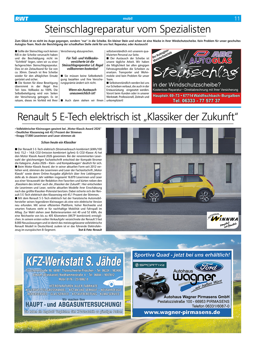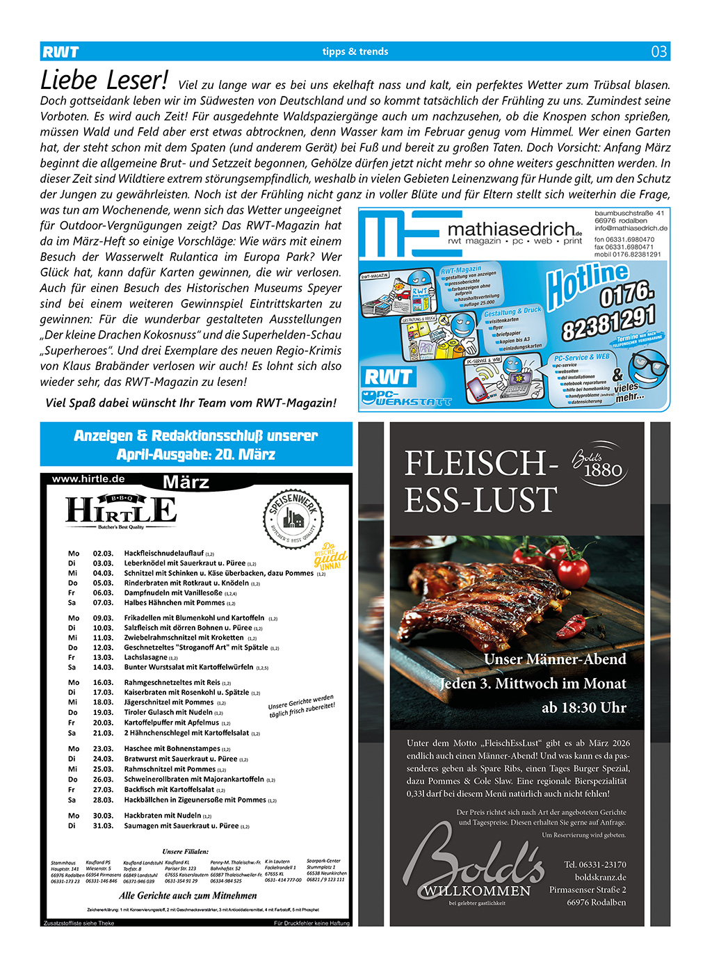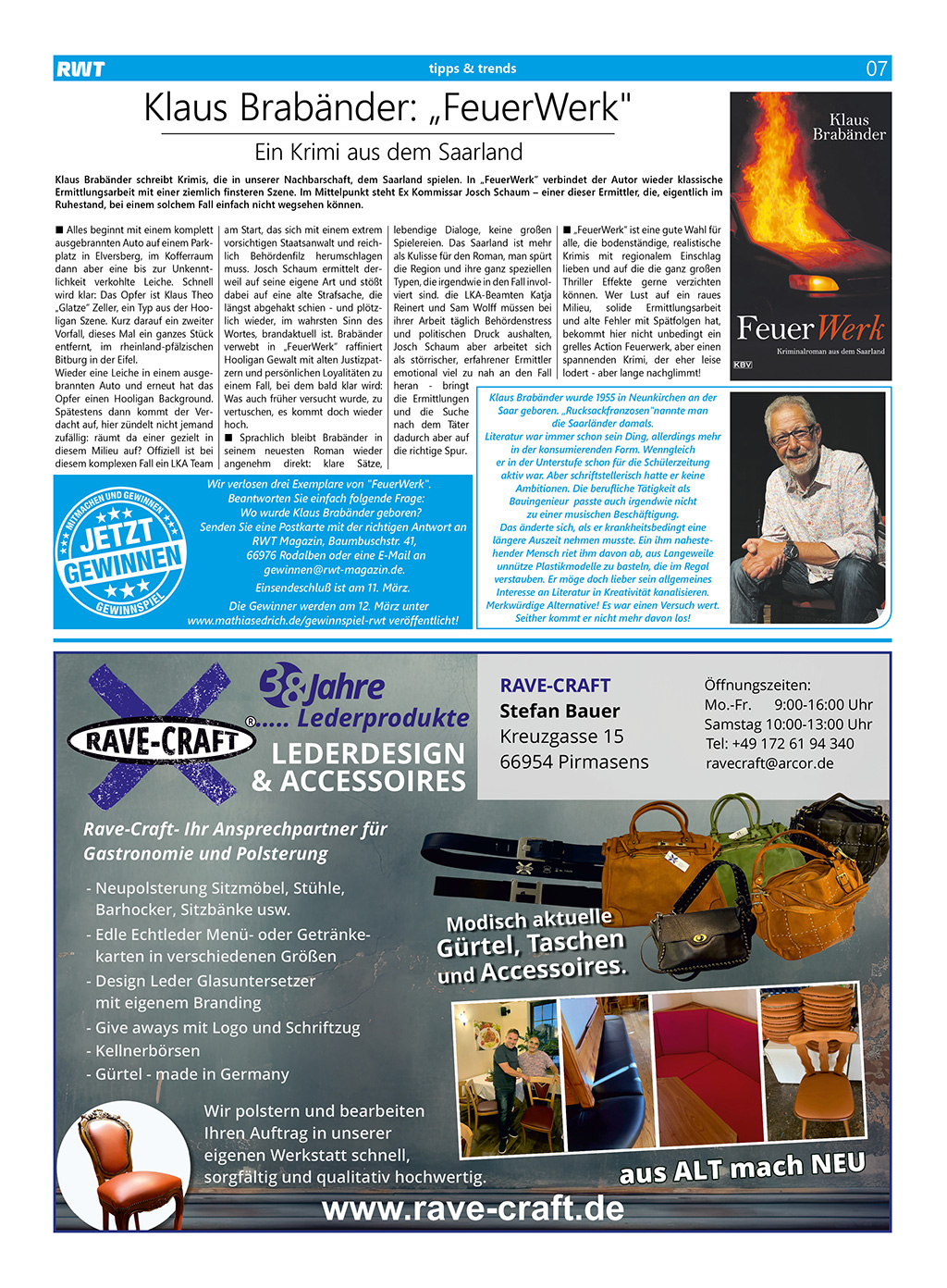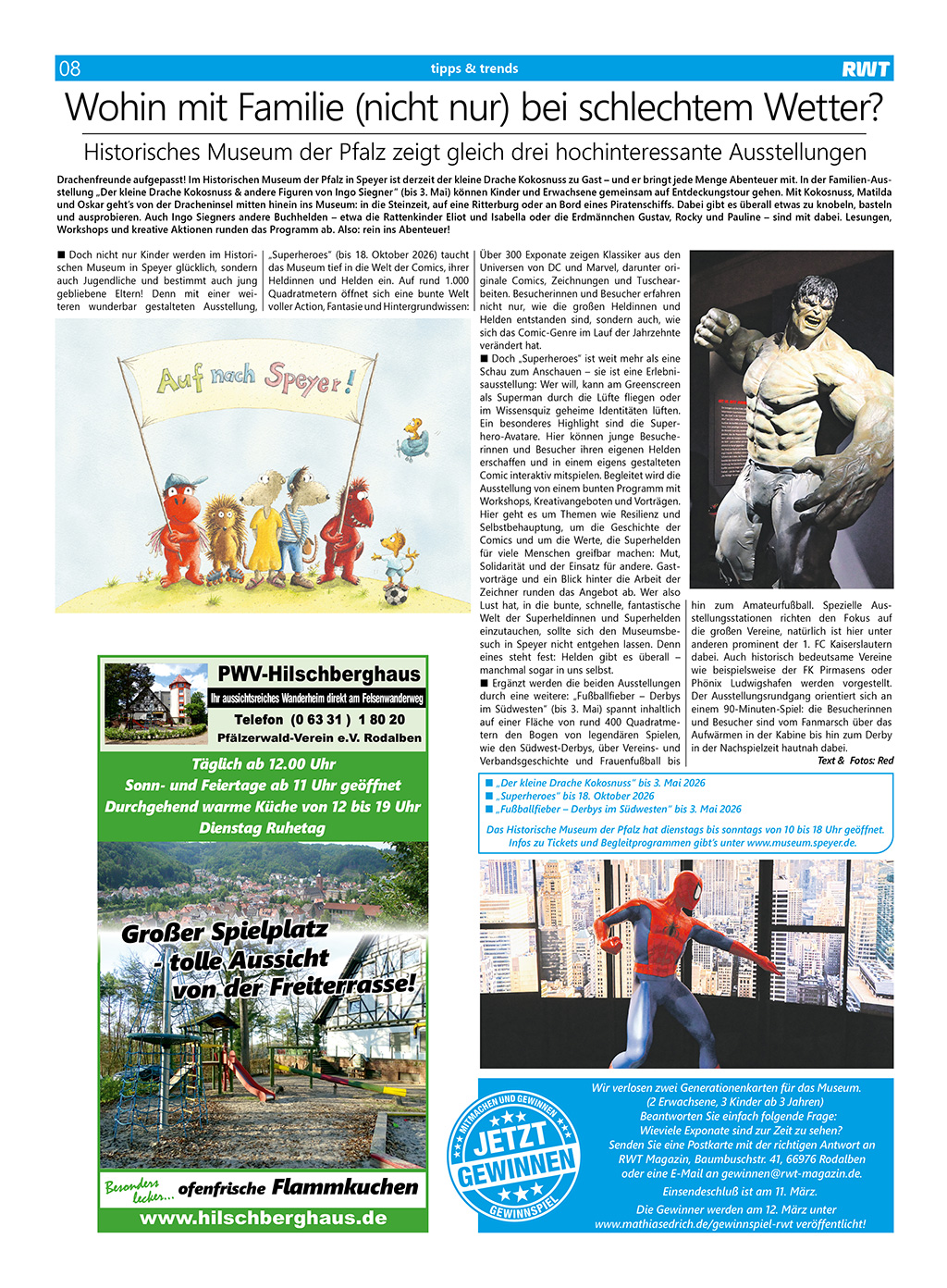 Gewinnspiele RWT Magazin März 2026 Einsendeschluß für unsere Gewinnspiele ist am 11. März Die Gewinner werden am 12. März an dieser Stelle veröffentlicht! Viel Spaß beim Rätseln! Sendet einfach eine Postkarte mit der Lösung bzw. dem Stichwort an: RWT Magazin, Baumbuschtstr. 41, 66976 Rodalben oder eine E-Mail an gewinnen@rwt-magazin.de Jetzt teilnehmen! Gewinner Ausgabe März …