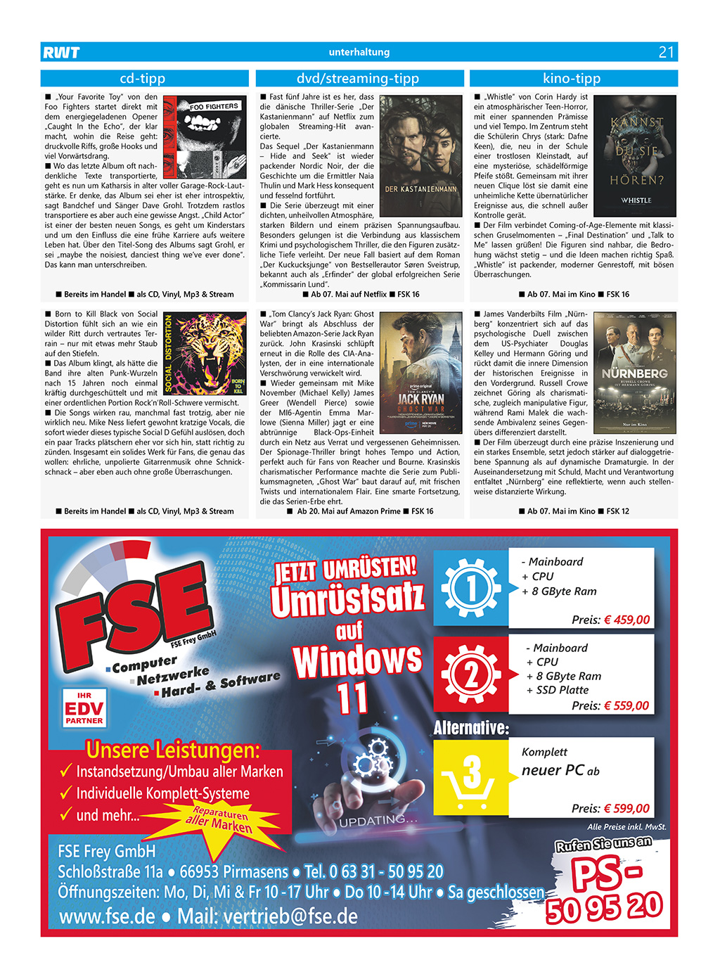 Gewinnspiele RWT Magazin April 2026 Einsendeschluß für unsere Gewinnspiele ist am 07. April Die Gewinner werden am 08. April an dieser Stelle veröffentlicht! Viel Spaß beim Rätseln! Sendet einfach eine Postkarte mit der Lösung bzw. dem Stichwort an: RWT Magazin, Baumbuschtstr. 41, 66976 Rodalben oder eine E-Mail an gewinnen@rwt-magazin.de Jetzt teilnehmen! Gewinner Ausgabe April …