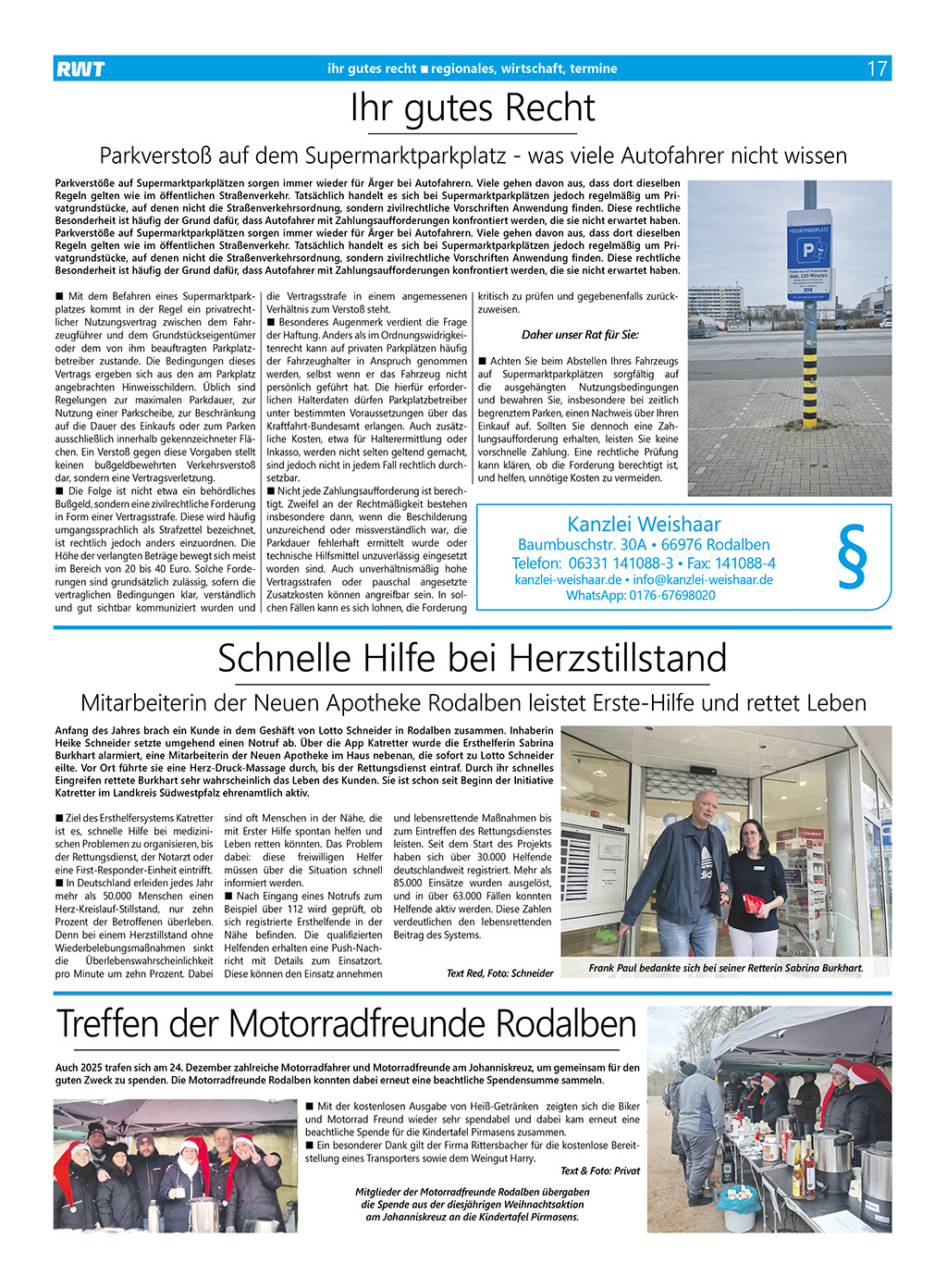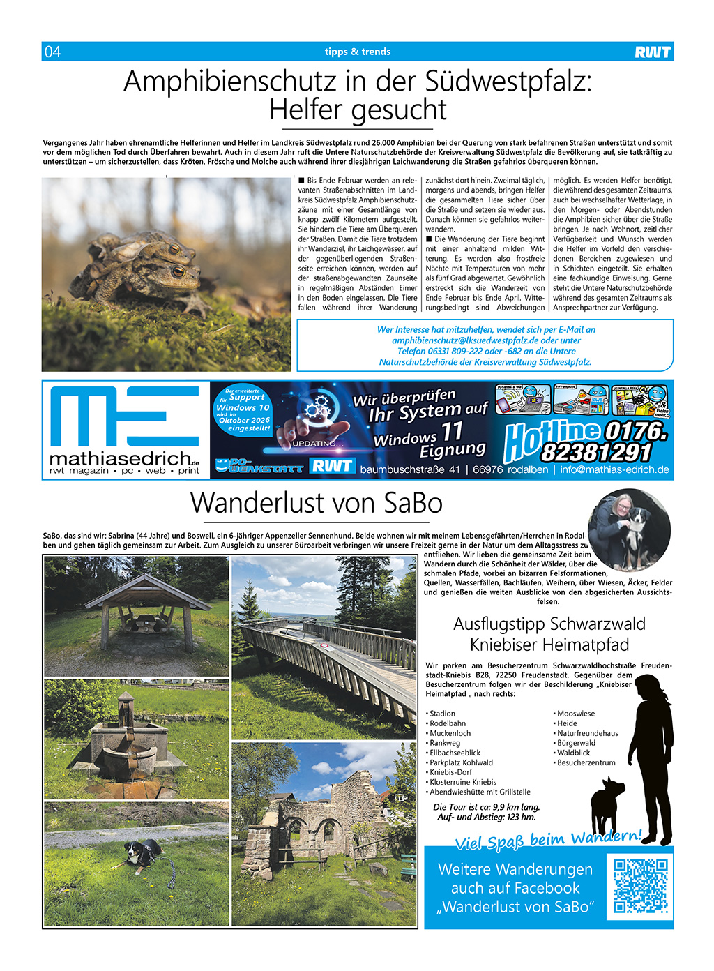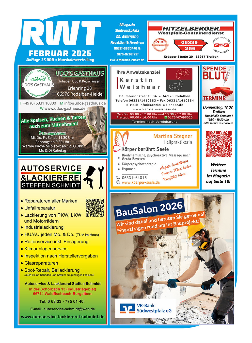 RWT Magazin, Baumbuschtstr. 41, 66976 Rodalbenoder eine E-Mail an gewinnen@rwt-magazin.de